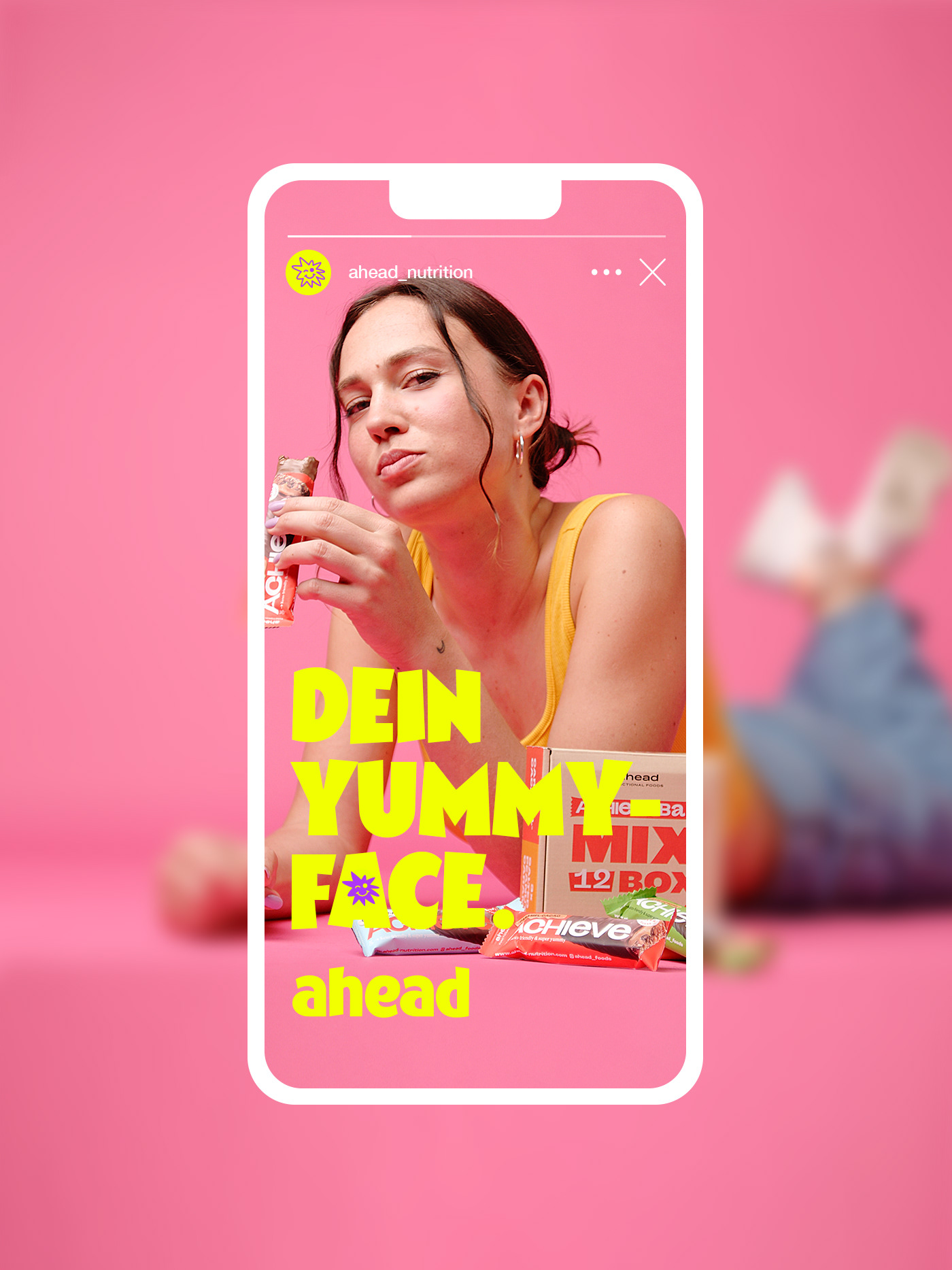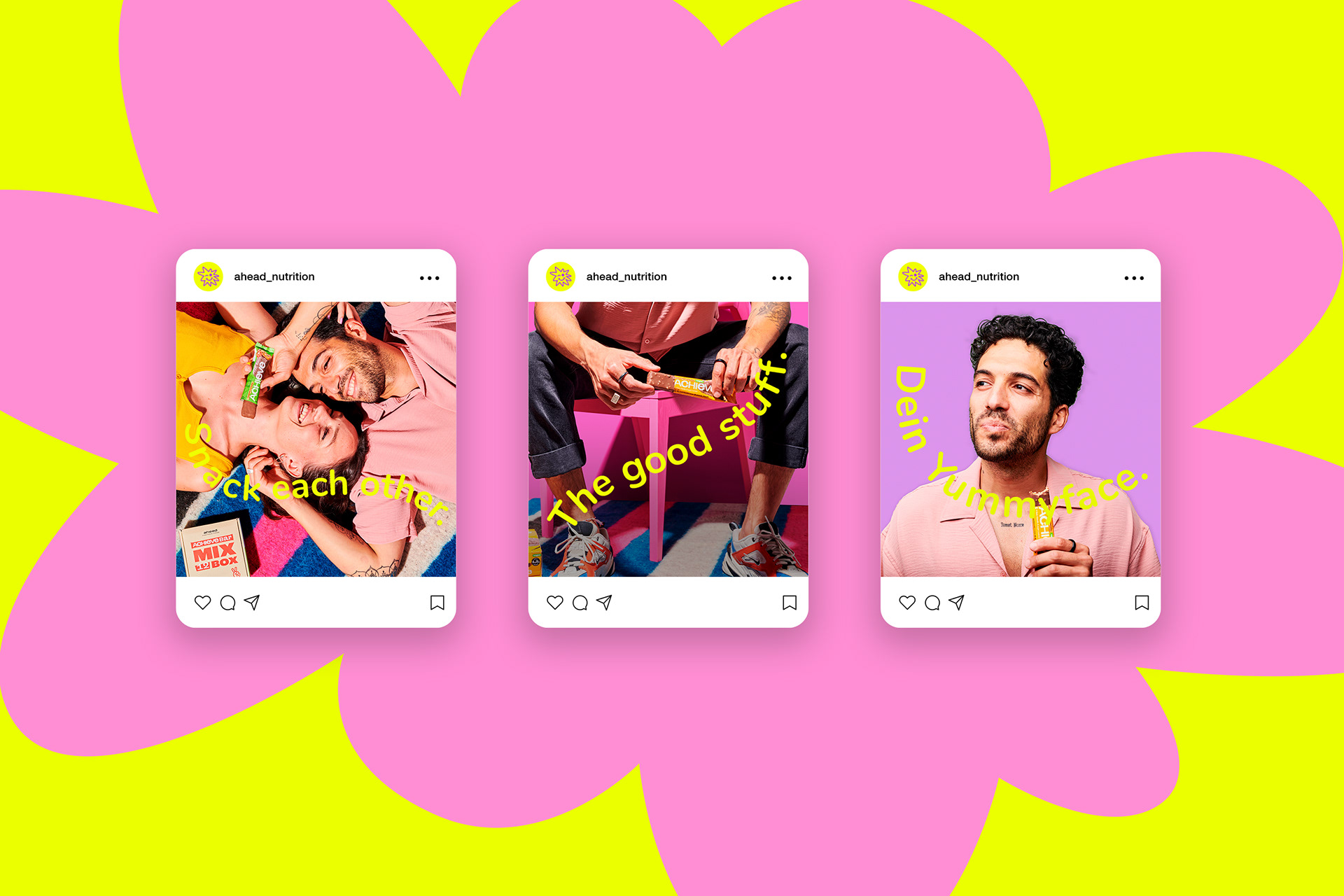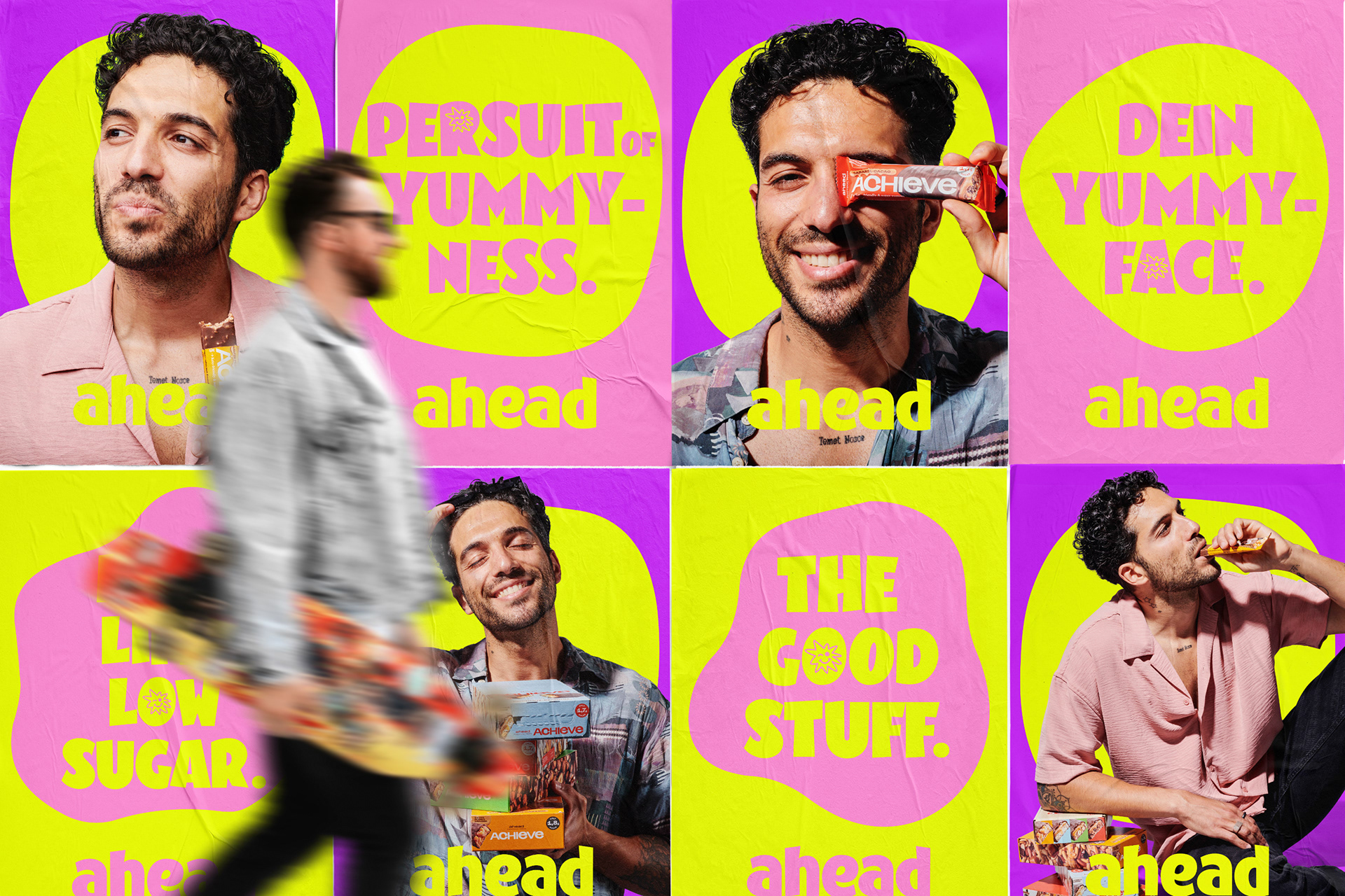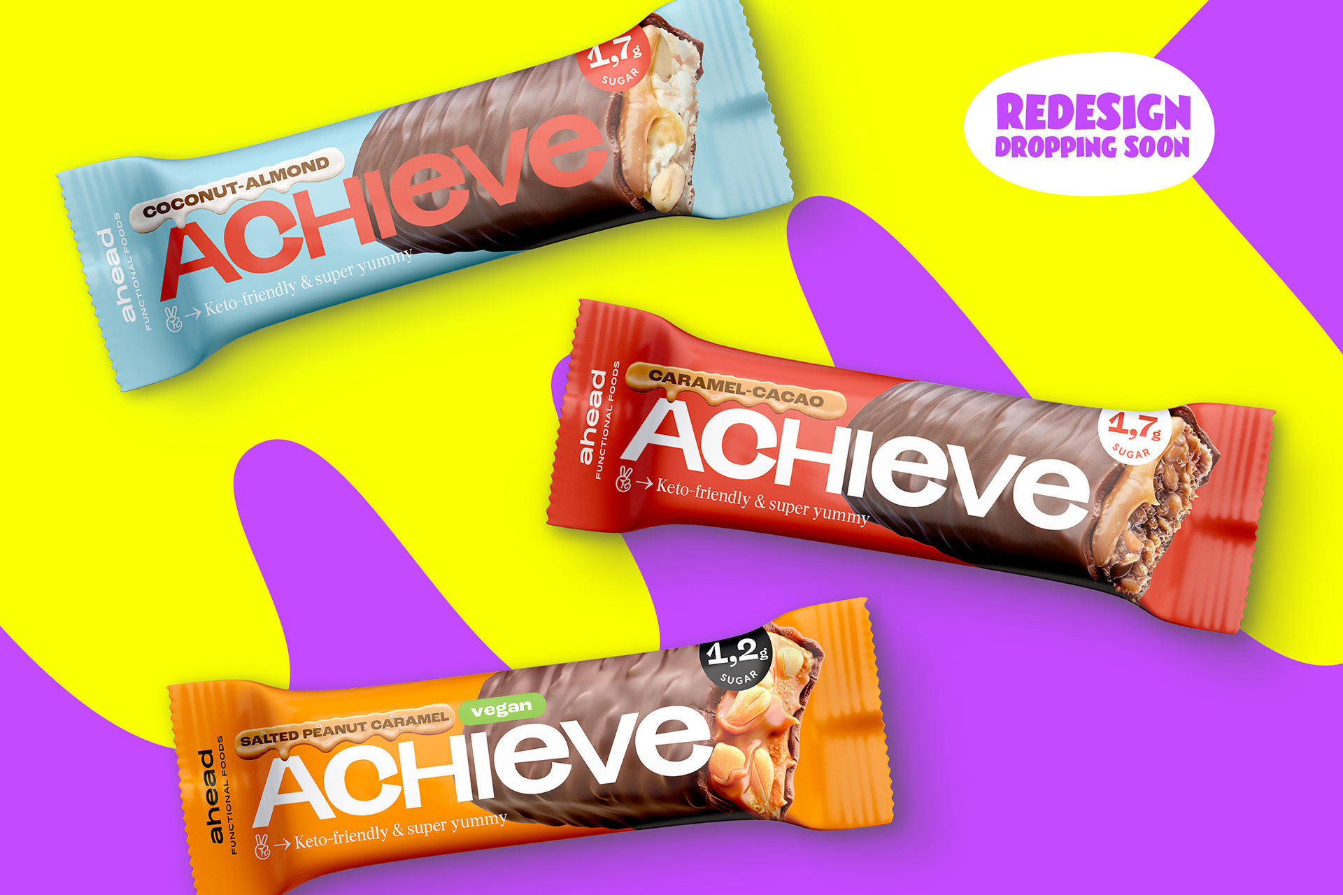 ahead setzt auf süßen Genuss ohne schlechtes Gewissen und vor allem ohne leere Kalorien. Geschmack hat für das Hamburger Food-Start-Up dabei oberste Priorität, sowie alle wichtigen Nährstoffe, die der Körper wirklich braucht. Wie Proteine, Ballaststoffe und gute Fette. 2022 haben wir ahead foods bei ihrem zweiten Redesignprozess begleitet mit dem Ziel, die Marke deutlich lauter, more edgy und bolder aufzustellen. So entstand ein aufmerksamkeitsstarkes Markenkonzept mit knalligen Colorblockings, cartoonesquer Typografie und einer Bildsprache, die einfach nur „Yummy!“ schreit. Seit Ende letzten Jahres sind die Produkte von ahead nun auch bei Rewe gelistet.