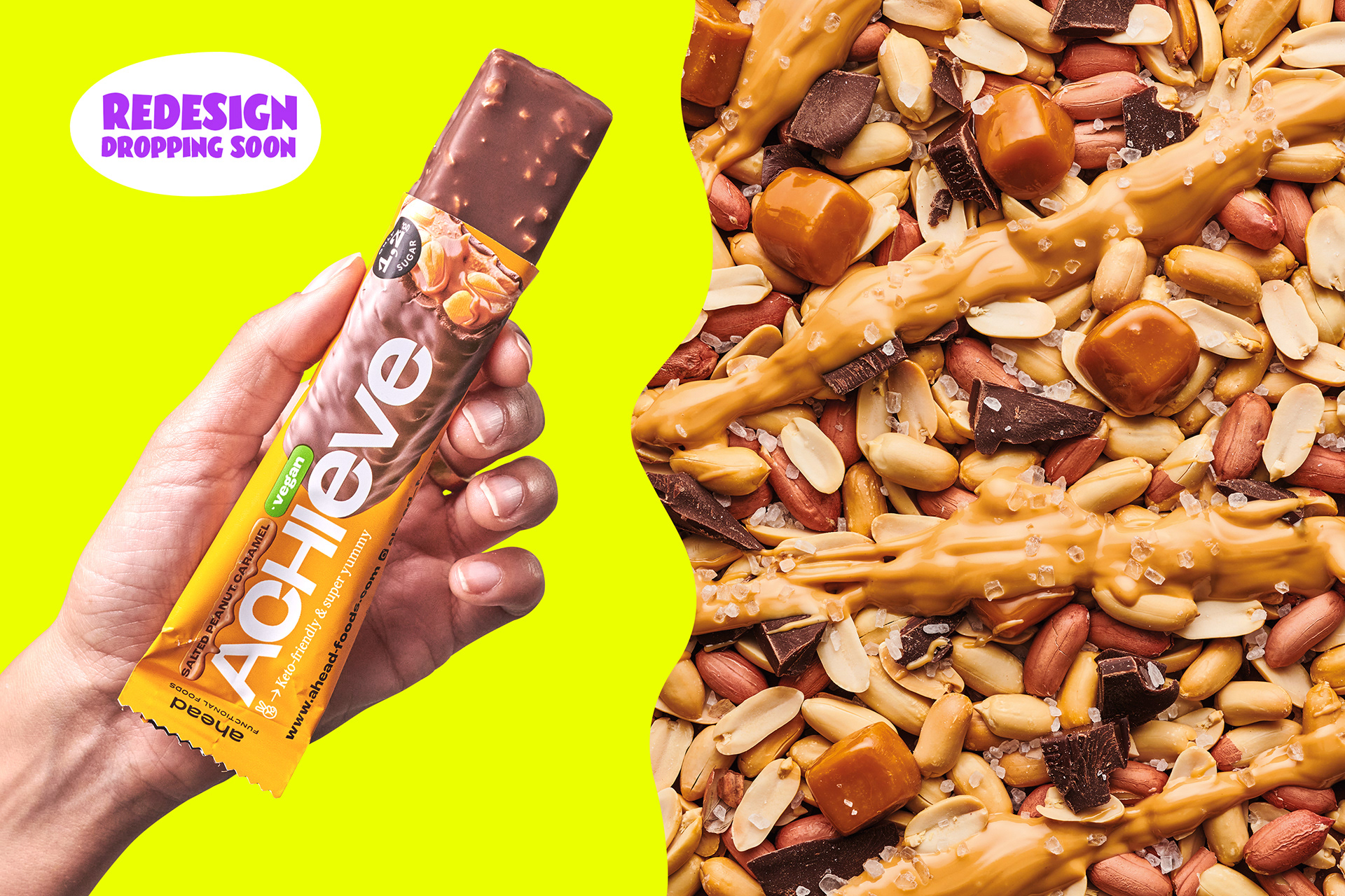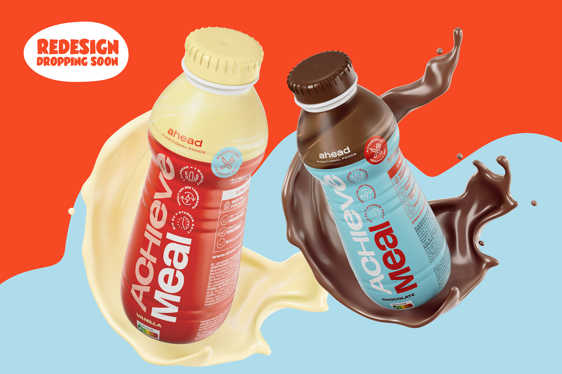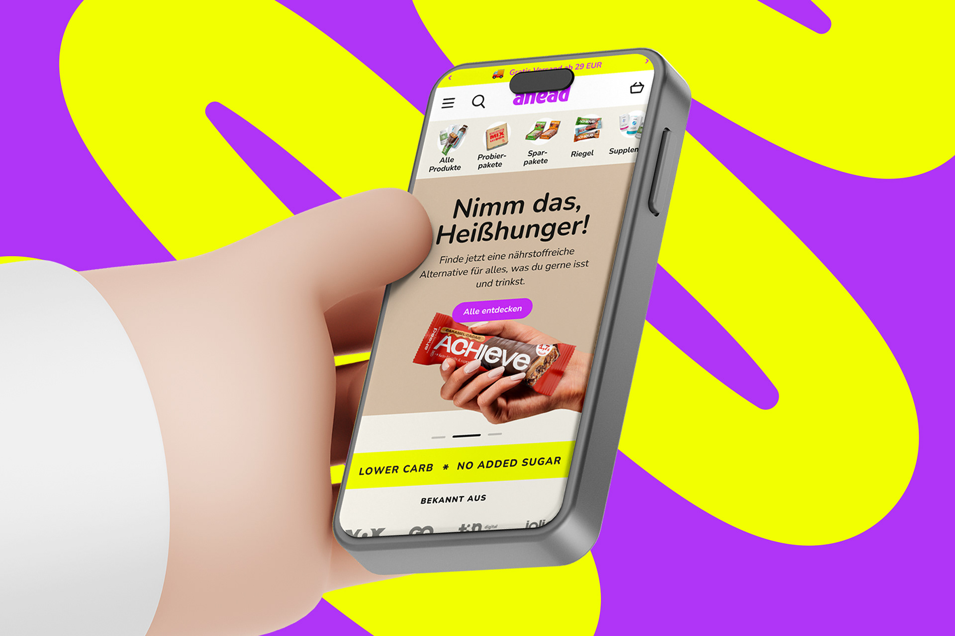 ahead setzt auf süßen Genuss ohne schlechtes Gewissen und vor allem ohne leere Kalorien. Geschmack hat für das Hamburger Food-Start-Up dabei oberste Priorität, sowie alle wichtigen Nährstoffe, die der Körper wirklich braucht. Wie Proteine, Ballaststoffe und gute Fette. 2022 haben wir ahead foods bei ihrem zweiten Redesignprozess begleitet mit dem Ziel, die Marke deutlich lauter, more edgy und bolder aufzustellen. So entstand ein aufmerksamkeitsstarkes Markenkonzept mit knalligen Colorblockings, cartoonesquer Typografie und einer Bildsprache, die einfach nur „Yummy!“ schreit. Seit Ende letzten Jahres sind die Produkte von ahead nun auch bei Rewe gelistet.