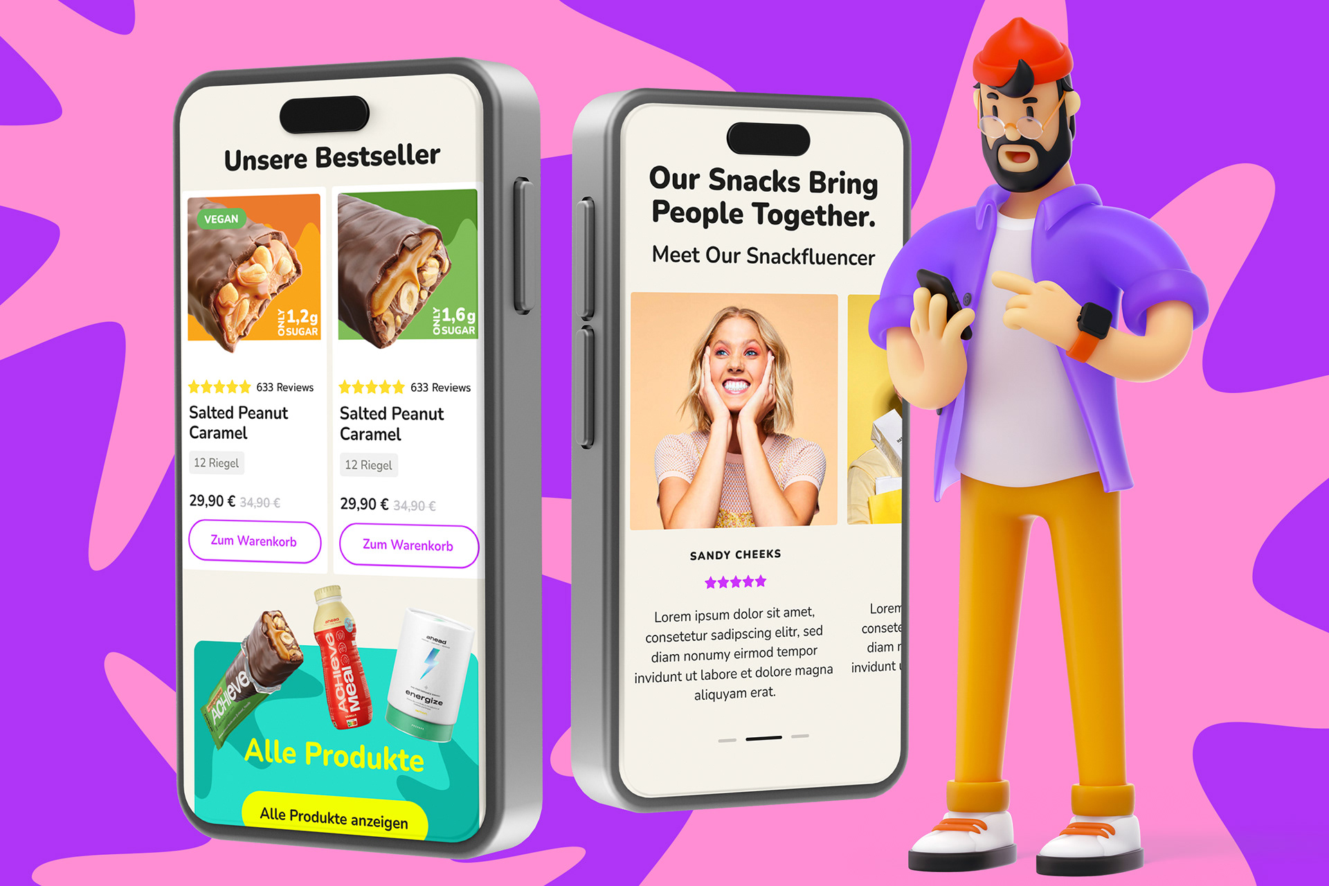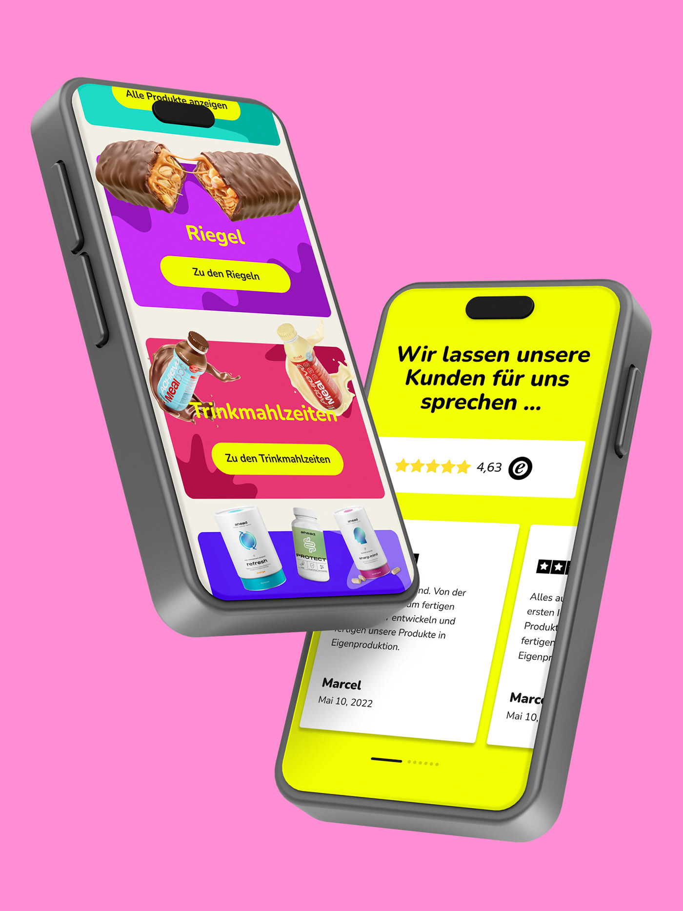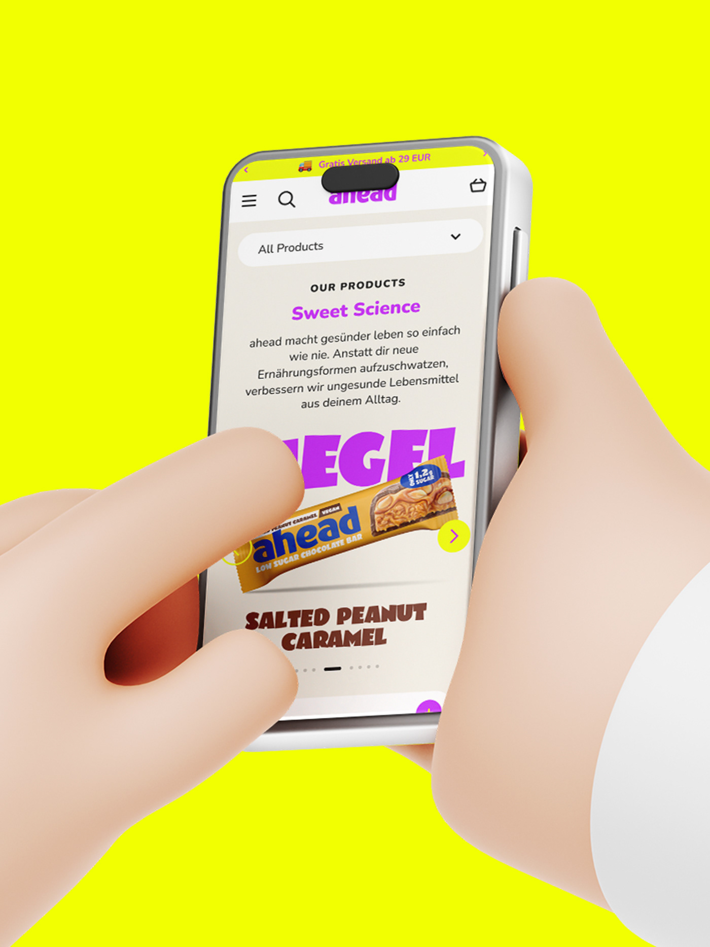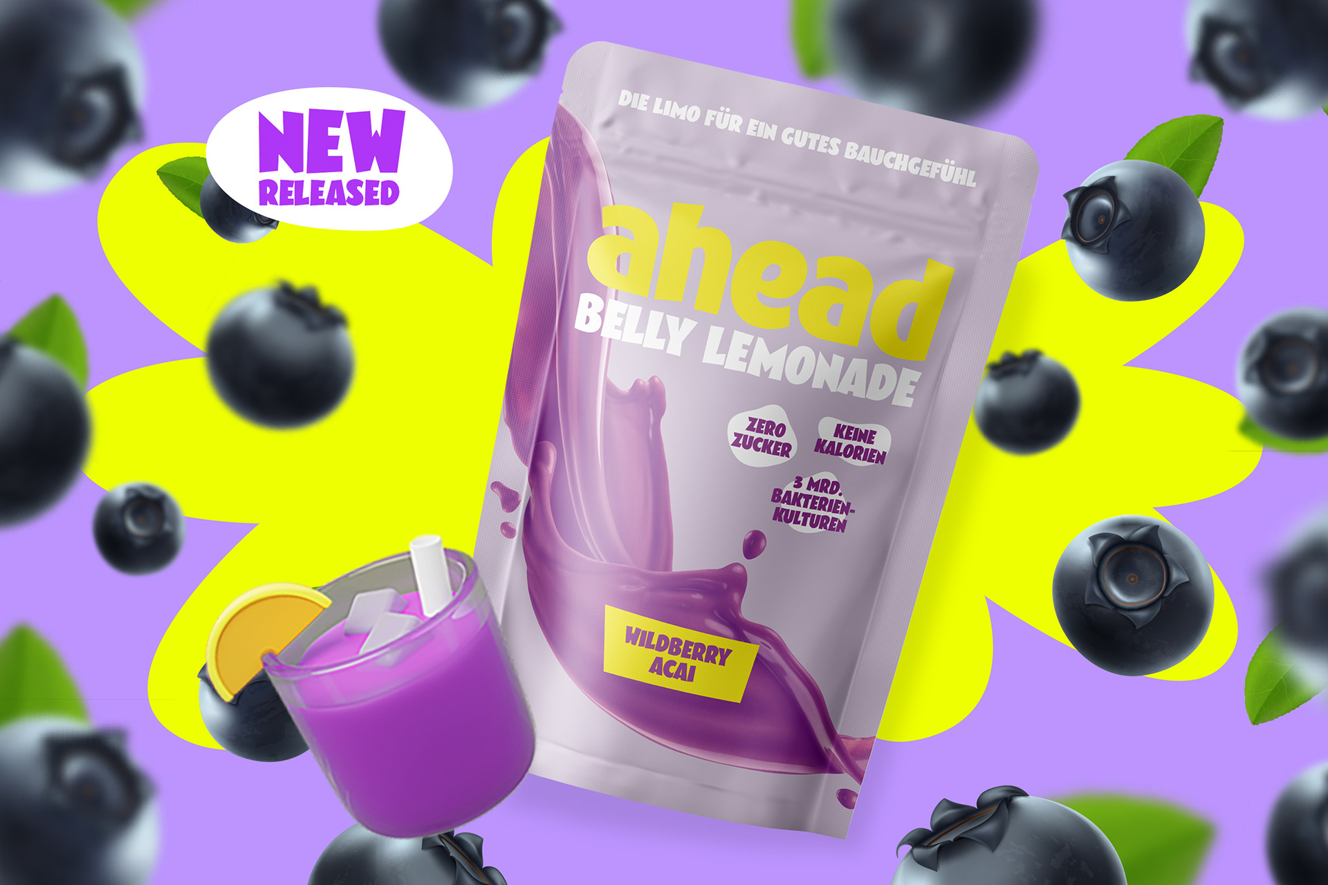 ahead setzt auf süßen Genuss ohne schlechtes Gewissen und vor allem ohne leere Kalorien. Geschmack hat für das Hamburger Food-Start-Up dabei oberste Priorität, sowie alle wichtigen Nährstoffe, die der Körper wirklich braucht. Wie Proteine, Ballaststoffe und gute Fette. 2022 haben wir ahead foods bei ihrem zweiten Redesignprozess begleitet mit dem Ziel, die Marke deutlich lauter, more edgy und bolder aufzustellen. So entstand ein aufmerksamkeitsstarkes Markenkonzept mit knalligen Colorblockings, cartoonesquer Typografie und einer Bildsprache, die einfach nur „Yummy!“ schreit. Seit Ende letzten Jahres sind die Produkte von ahead nun auch bei Rewe gelistet.