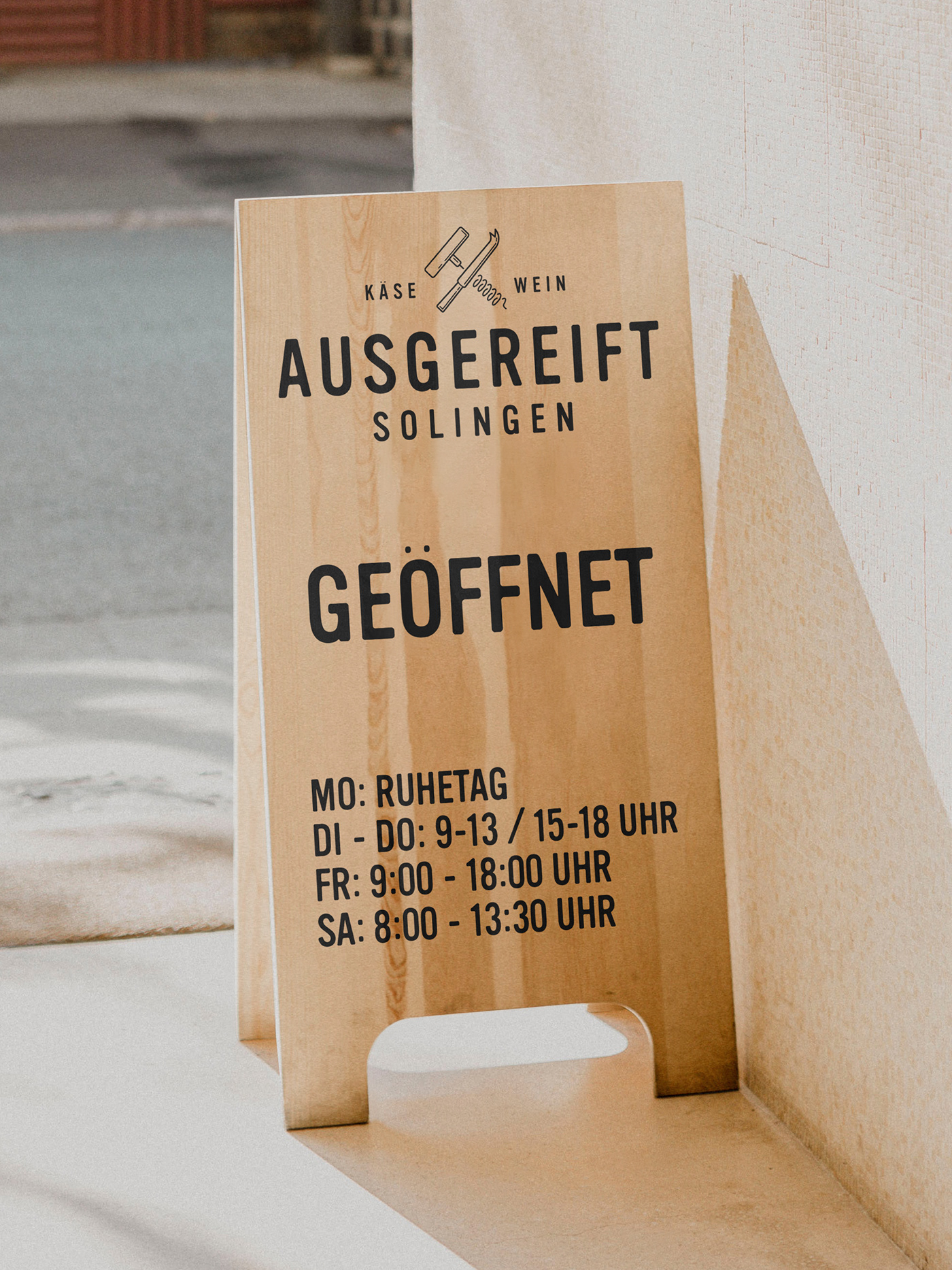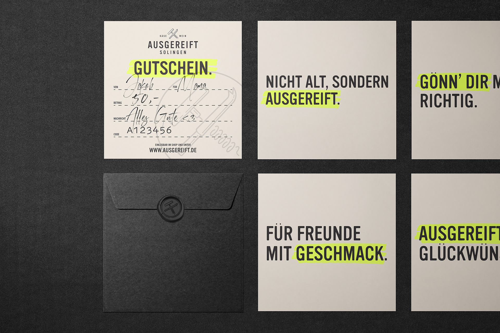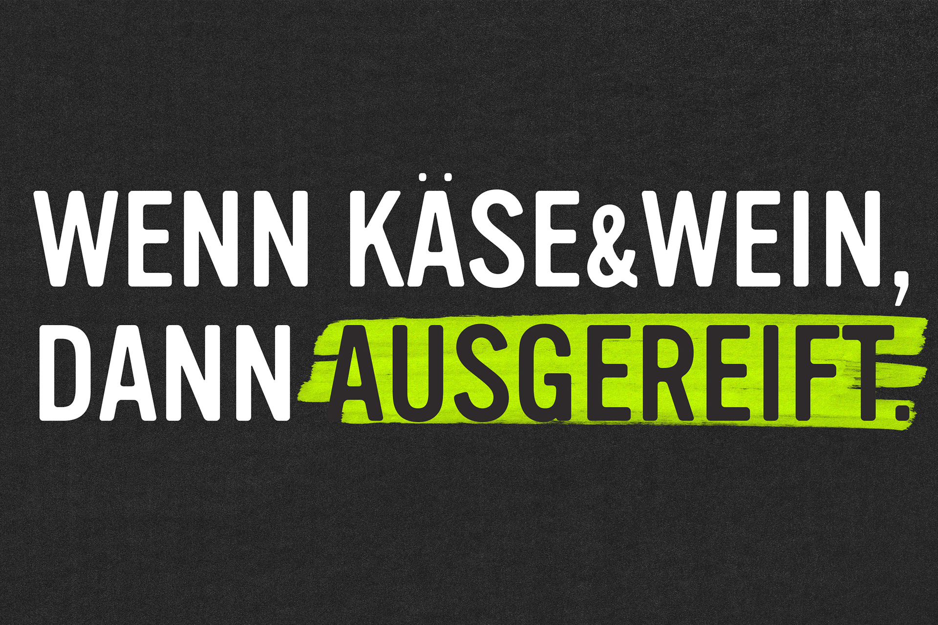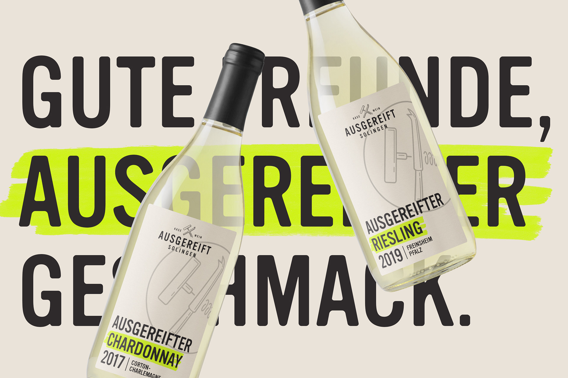 Ausgereift stands for expertise and quality, for perfect timing and outstanding taste. Indulgence in its most original form, the combination of food and drink, the appreciation for craftsmanship and origin, the enthusiasm for conviviality and culinary delight. In 2017, an old school friend asked us to help with his new cheese and wine boutique in Solingen. This resulted in a bold and fresh brand concept for tradition-bound cheese connoisseurs and the vino enthusiasts of tomorrow. Today, Ausgereift Käse&Wein is a flourishing place to go for regular customers and a permanent culinary fixture in Solingen's city centre and beyond.