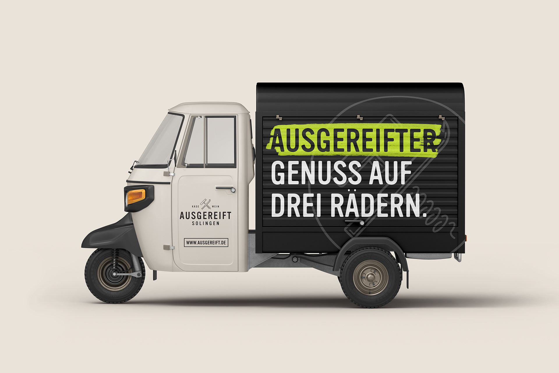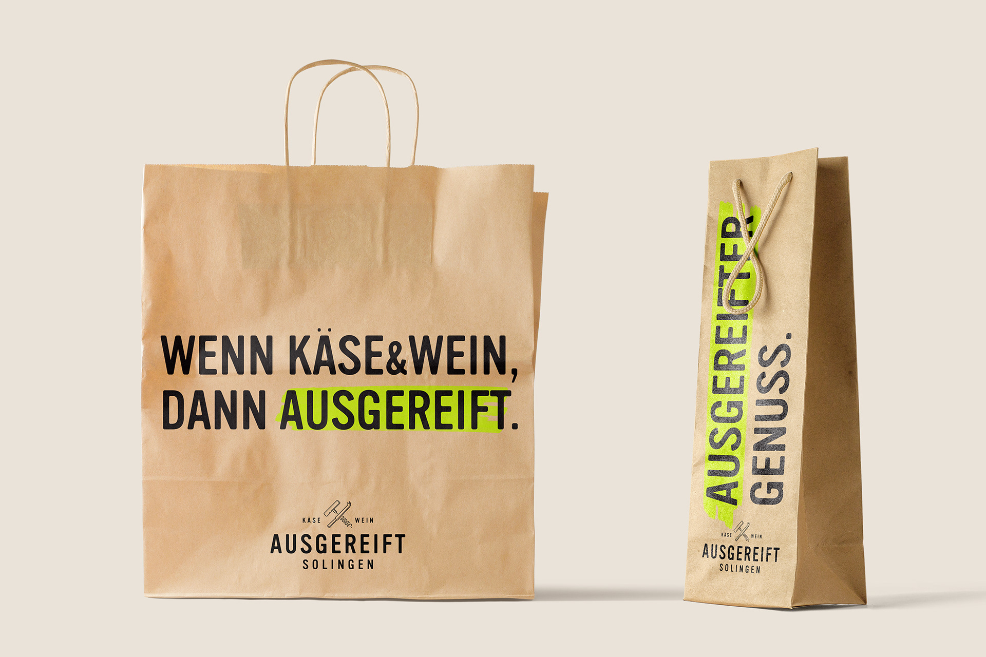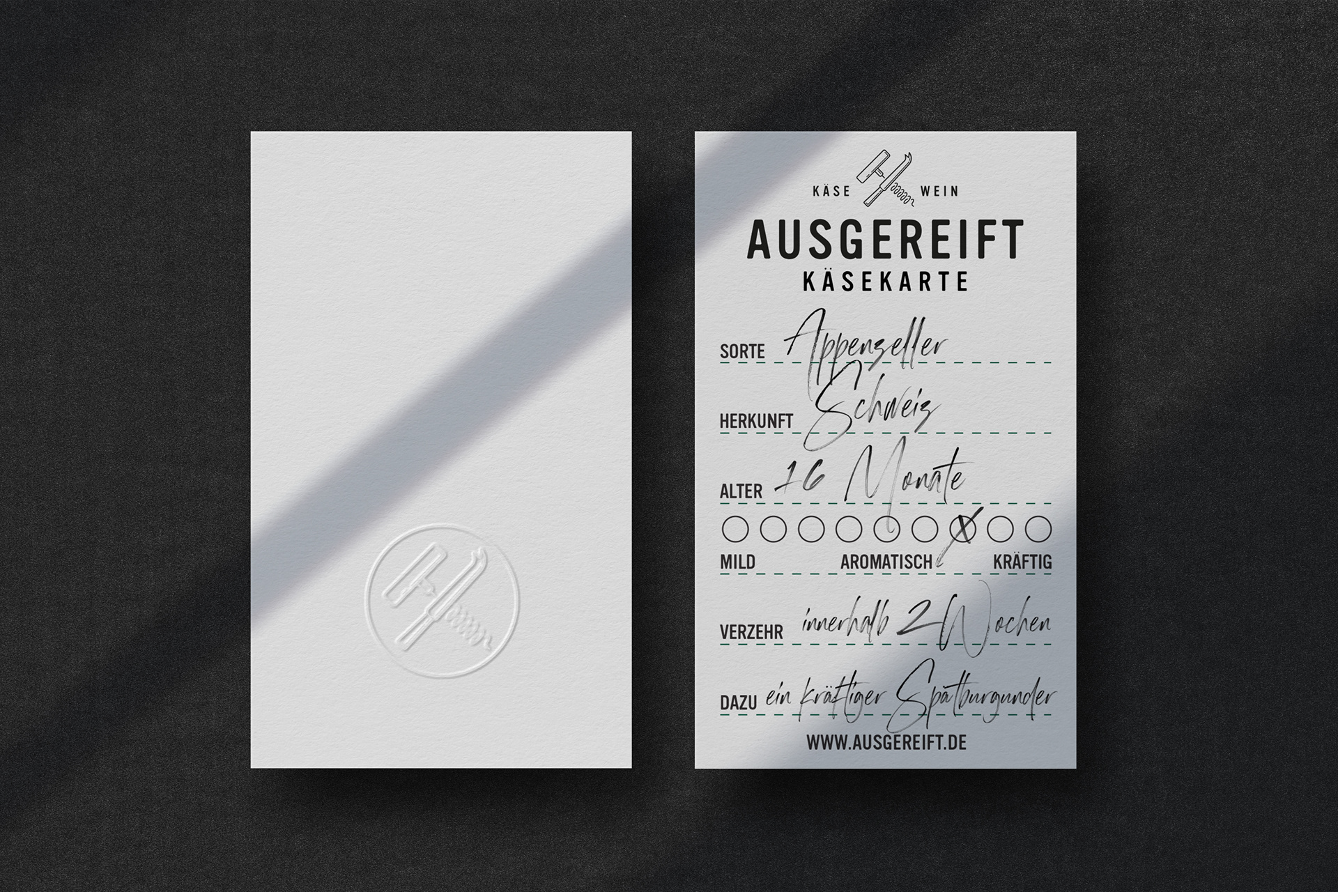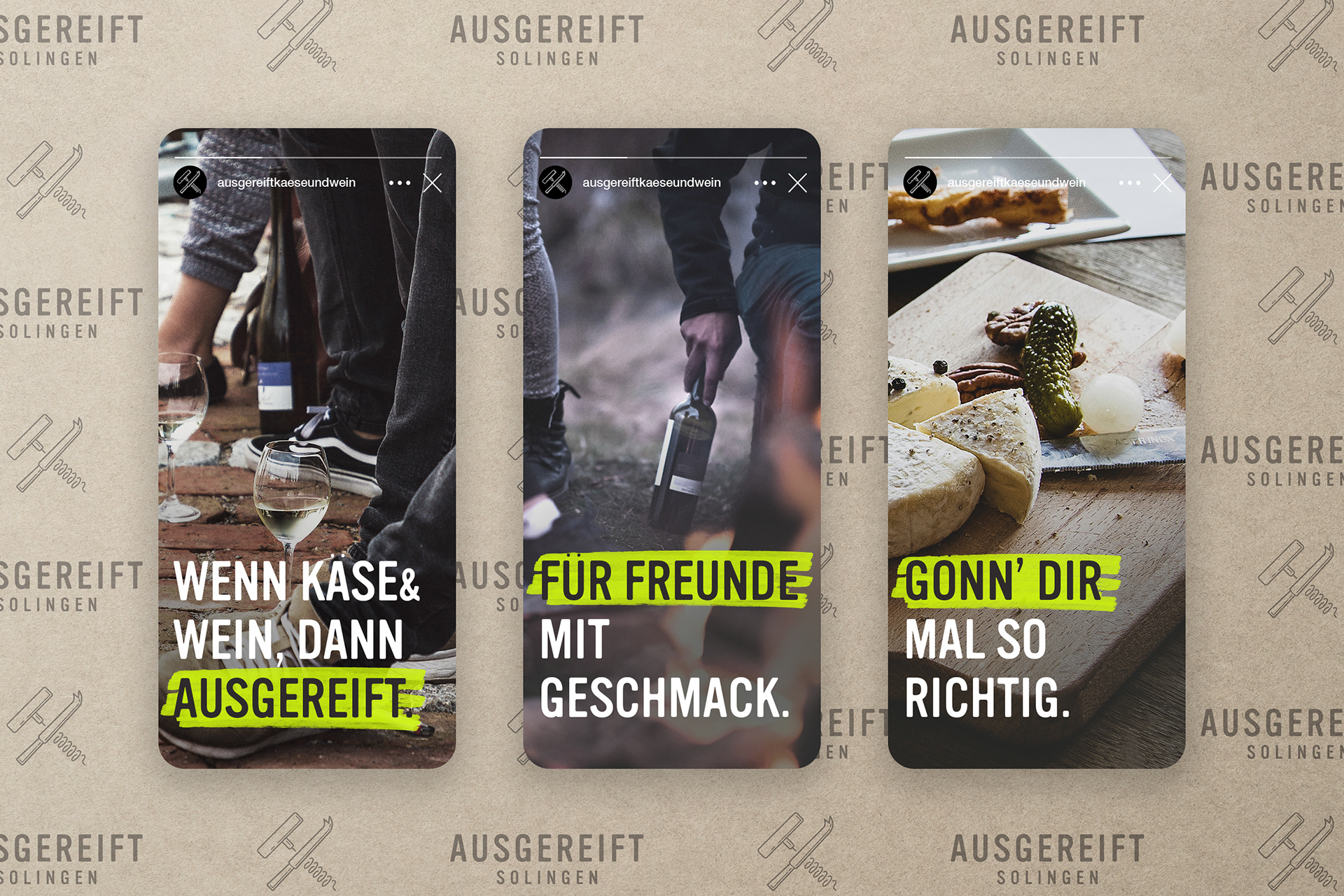 Ausgereift stands for expertise and quality, for perfect timing and outstanding taste. Indulgence in its most original form, the combination of food and drink, the appreciation for craftsmanship and origin, the enthusiasm for conviviality and culinary delight. In 2017, an old school friend asked us to help with his new cheese and wine boutique in Solingen. This resulted in a bold and fresh brand concept for tradition-bound cheese connoisseurs and the vino enthusiasts of tomorrow. Today, Ausgereift Käse&Wein is a flourishing place to go for regular customers and a permanent culinary fixture in Solingen's city centre and beyond.