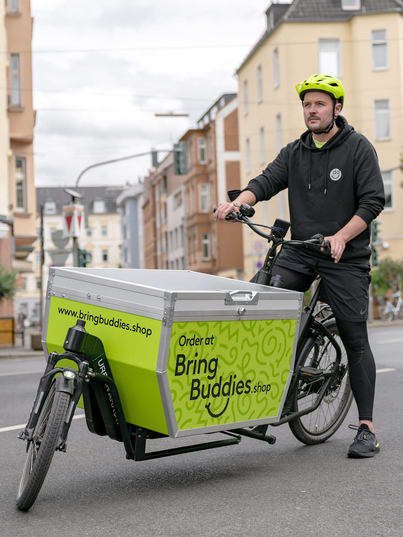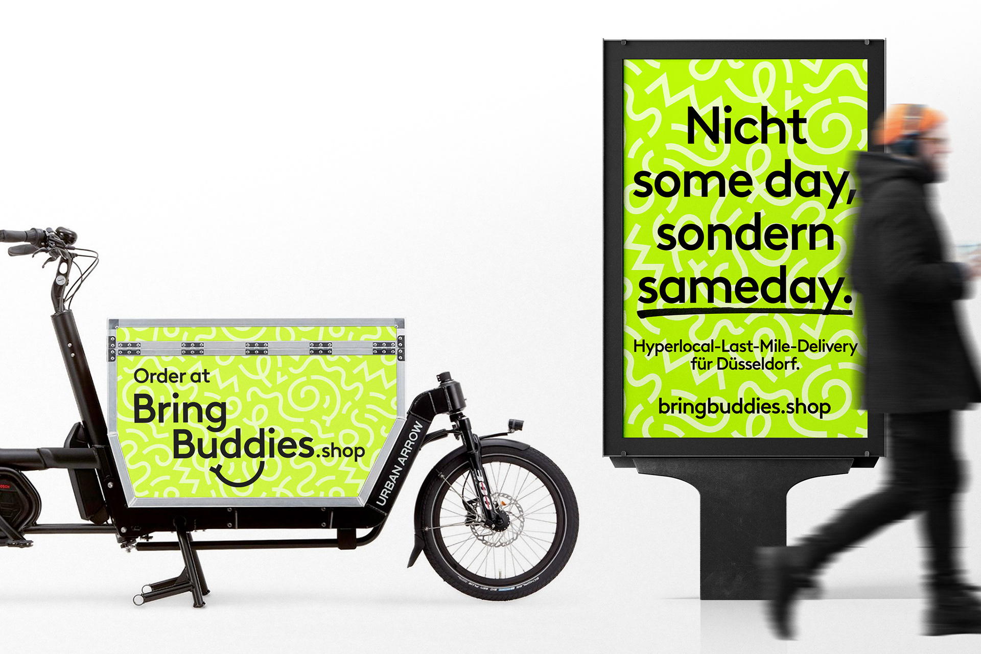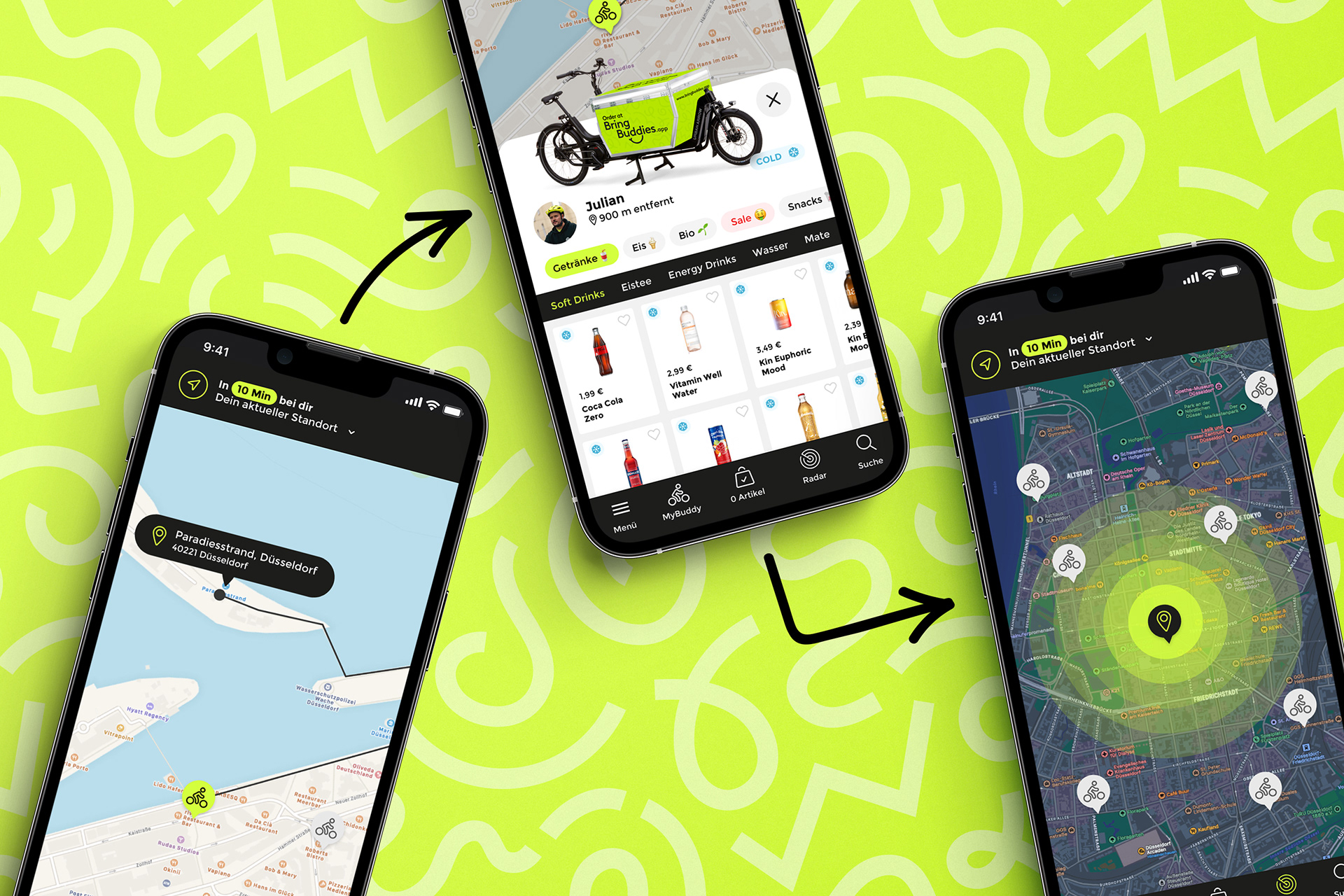 Das Projekt BringBuddies wurde 2019, zu Beginn der Coronakrise von Akre.Studio ins Leben gerufen um temporär den lokalen Einzelhandel zu unterstützen und den Menschen eine Möglichkeit zu bieten, Dinge des täglichen Bedarfs wie bspw. Kaffee, Blumen und Waren lokaler Onlineshops nach Hause geliefert zu bekommen. Aus dieser fixen Idee ist das Konzept eines Hyperlokalen-Last-Mile-Lieferdienst gewachsen, der als eigenständiges Start-Up langfristig das Einkaufserlebnis innerhalb der Stadt auf ein neues Level heben sollte. Unter dem Motto “Shop online, buy local.” wollten wir ein kollektives Einzelhandelsnetzwerk erschaffen, dessen Angebot über eine Online-Marketplace-Plattform bestellt und via E-Lastenbikes innerhalb kürzester Zeit zum Endverbraucher geliefert werden sollte. Nach anfänglich überaus positivem Feedback der Shops sowie der Kunden konnte sich BringBuddies leider nicht gegen den rasanten Aufstieg zahlreicher, namhafter Competitor durchsetzen. So widmeten wir uns wieder unserem Kerngeschäft von Akre.Studio und sehen in BringBuddies heute eine spannende und vielseitige Lebenserfahrung.