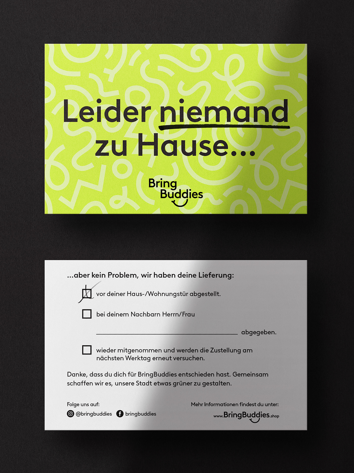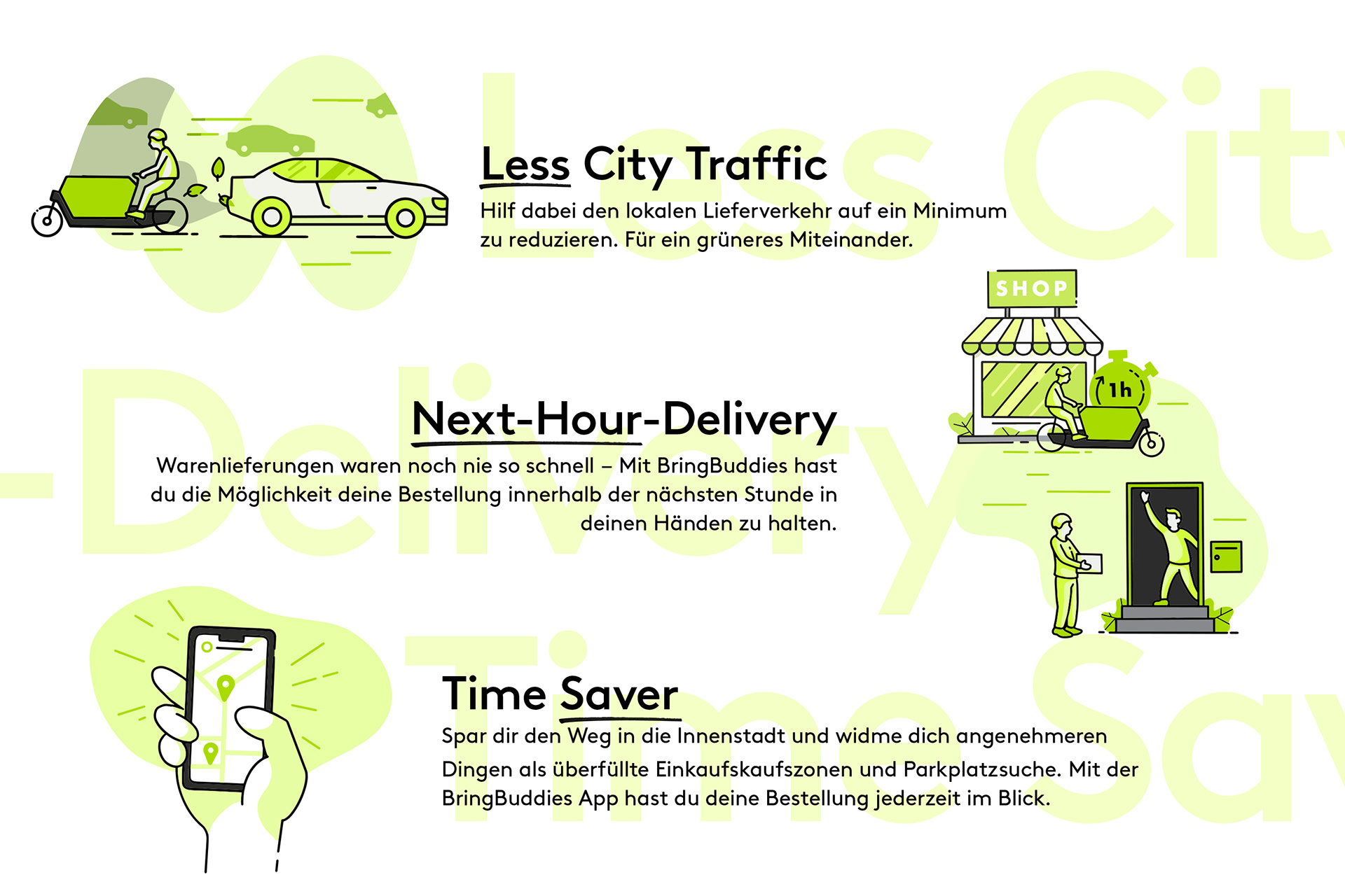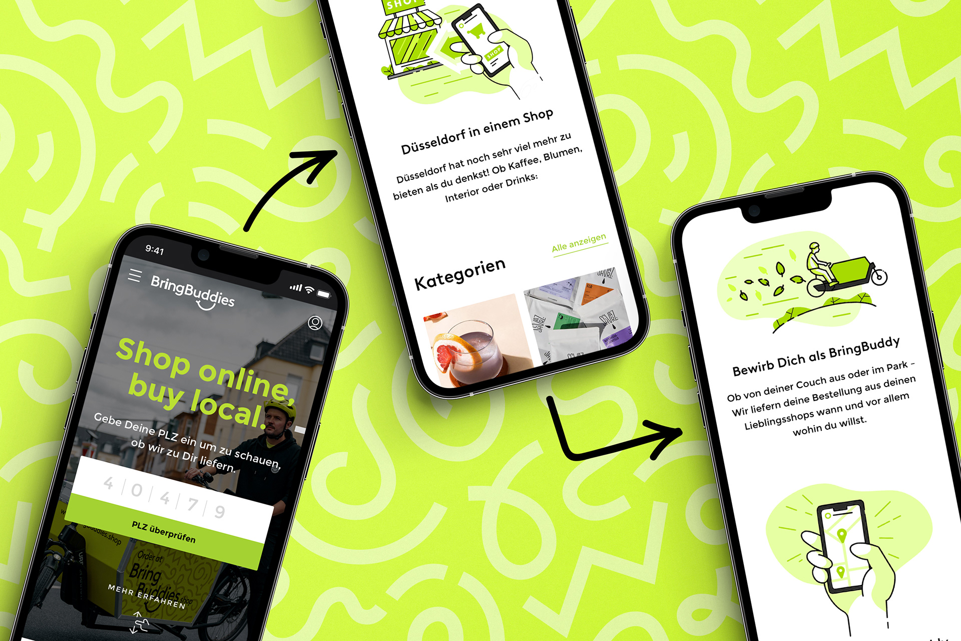 Das Projekt BringBuddies wurde 2019, zu Beginn der Coronakrise von Akre.Studio ins Leben gerufen um temporär den lokalen Einzelhandel zu unterstützen und den Menschen eine Möglichkeit zu bieten, Dinge des täglichen Bedarfs wie bspw. Kaffee, Blumen und Waren lokaler Onlineshops nach Hause geliefert zu bekommen. Aus dieser fixen Idee ist das Konzept eines Hyperlokalen-Last-Mile-Lieferdienst gewachsen, der als eigenständiges Start-Up langfristig das Einkaufserlebnis innerhalb der Stadt auf ein neues Level heben sollte. Unter dem Motto “Shop online, buy local.” wollten wir ein kollektives Einzelhandelsnetzwerk erschaffen, dessen Angebot über eine Online-Marketplace-Plattform bestellt und via E-Lastenbikes innerhalb kürzester Zeit zum Endverbraucher geliefert werden sollte. Nach anfänglich überaus positivem Feedback der Shops sowie der Kunden konnte sich BringBuddies leider nicht gegen den rasanten Aufstieg zahlreicher, namhafter Competitor durchsetzen. So widmeten wir uns wieder unserem Kerngeschäft von Akre.Studio und sehen in BringBuddies heute eine spannende und vielseitige Lebenserfahrung.